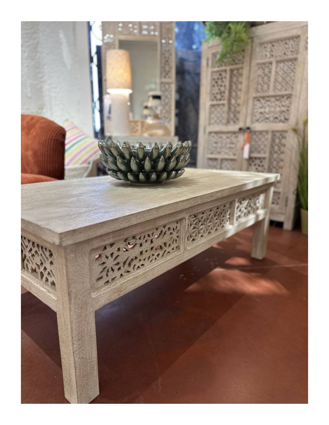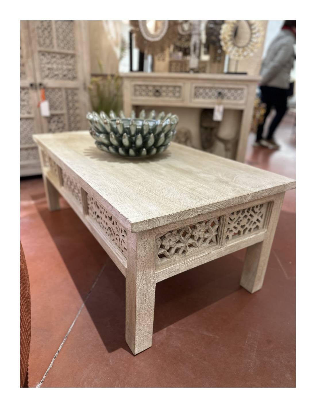 La table basse en bois sculpté se distingue par ses lignes sobres et son plateau rectangulaire.