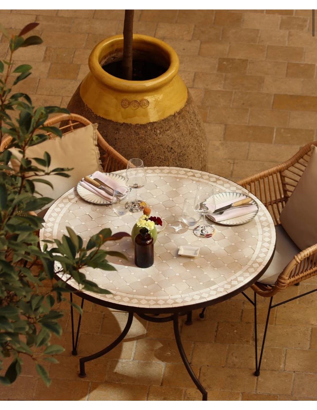 Cette table mosaïque accueille un magnifique plateau blanc/beige en carreaux de Zellige.