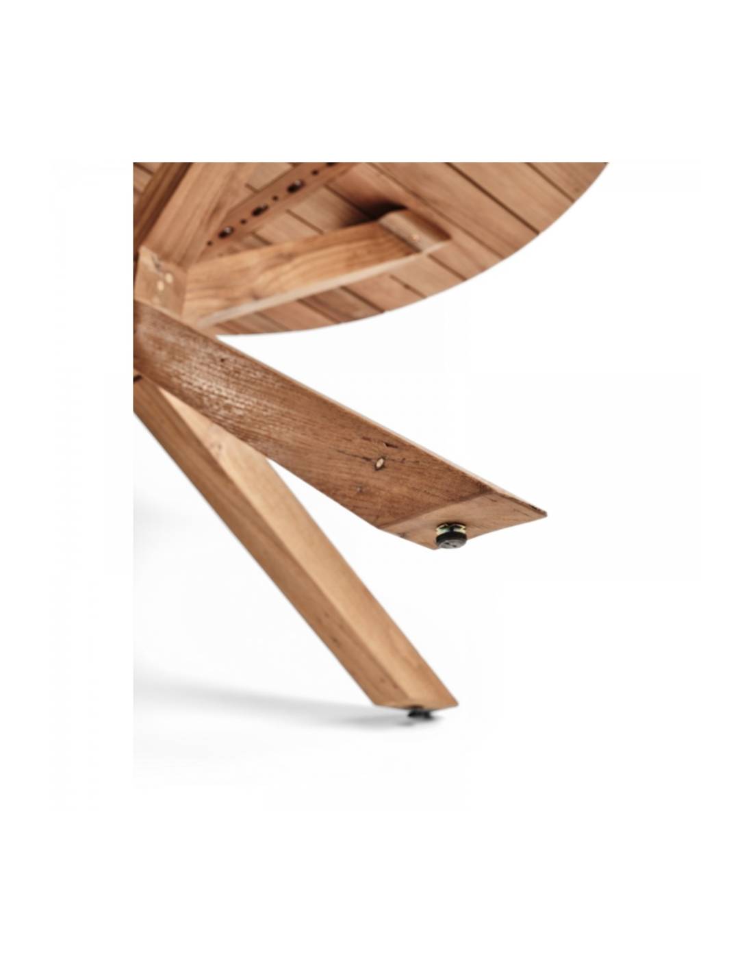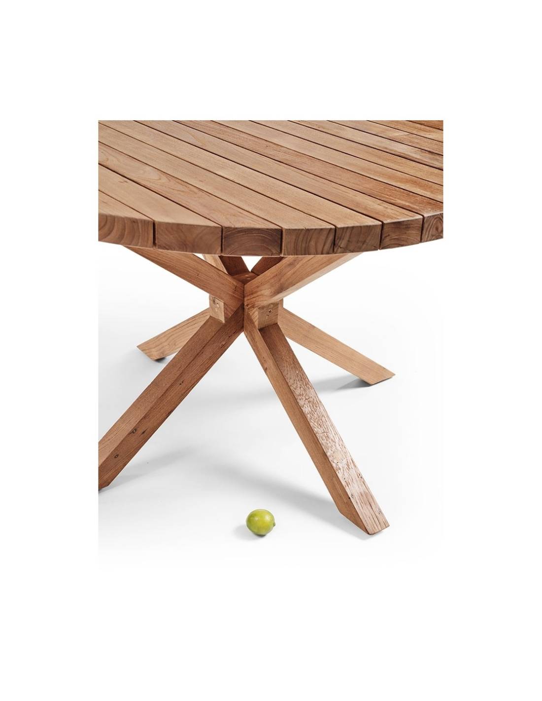 Son plateau en lattes de teck dévoile un veinage riche et authentique, tandis que son piétement croisé assure stabilité et équilibre.