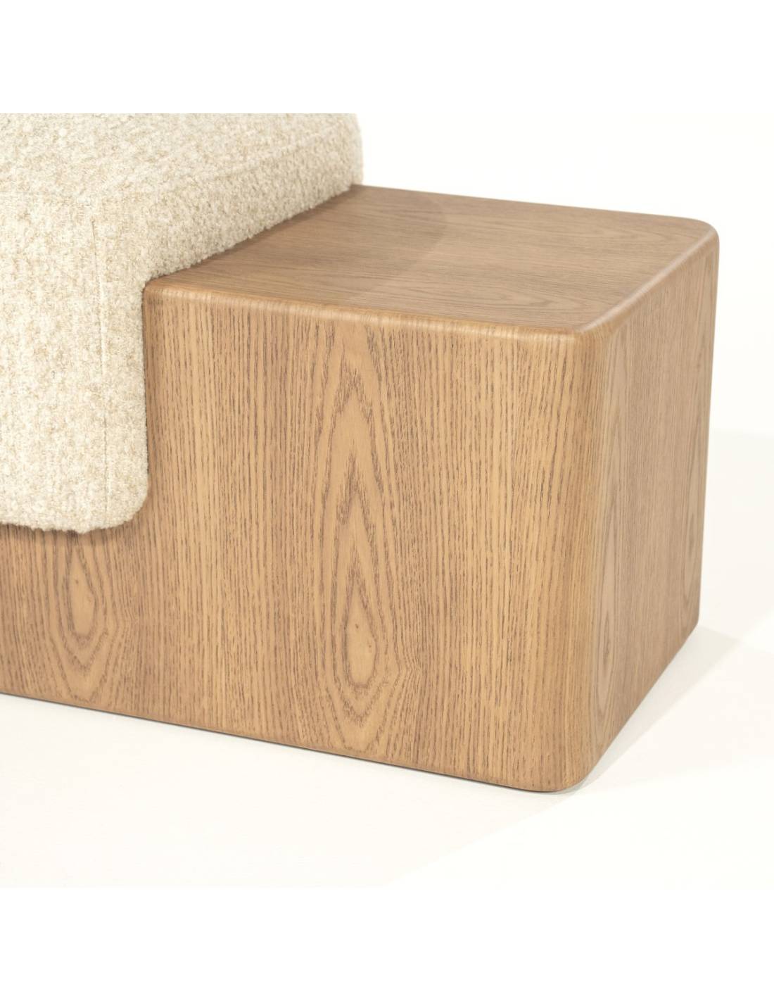 Une surface en bouclette texturée s’associe à une structure en frêne au veinage apparent et aux teintes naturelles.